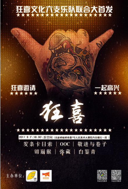 发条卡目索乐队来自天津,时隔五年携新专辑《扯》再次踏上“扯金”征途。依然是嬉笑怒骂,依然是严肃认真;OOC乐队2008成立于北京,2012年发行首张专辑《OOC》。OOC将不同年代和风格的音乐元素揉合,模糊了分类界限,化学反应出OOC独有的音乐语言。2017年签约狂喜文化推出最新作品《3》;弥藏乐队2001年成立于北京。2013年发行首张专辑《和时光赛跑》,奠定了其在国内蓝调音乐领域的重要地位,获得华语音乐传媒大奖及华语金曲奖“2014年度最佳蓝调艺人” 提名。2017年签约狂喜文化推出最新专辑《上帝不爱Blues》;白鉴青,独立音乐人。音乐学校毕业后从事音乐行业的幕后工作,后期找到了自己的审美偏向,注重于欧美独立音乐的表达,创作风格日趋多变,越发自由洒脱。2017年签约狂喜文化推出最新音乐作品《Silent Power》;敬进与卷子是来自兰州的音乐人。敬进钻研花儿和冬不拉,歌声骚气艳丽,有尘土也有芳香。他像个手工匠人,把各种管子改成乐器。卷子弹吉他,常会骑车到临近藏区教人弹琴。2017年签约狂喜文化将推出他们的首张专辑《新河图》;锵崩猴乐队2014年成立于北京,2016年发行首张ep《白忙一场》。2017年签约狂喜文化首发ep,主唱栗飞将携手内蒙的嘉宾乐手全新亮相。